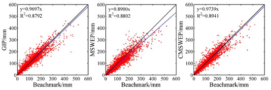 Figure 4 is the scatter plot of GIP, MSWEP, and CMSWEP and the gauge measurements at the monthly time scale. Table 3 shows the relevant quantitative accuracy indices. As can be seen from this table, GIP and CMSWEP have small systematic deviations at the monthly scale, with RBIAS being 0.57 and 0.36, respectively. MSWEP shows relatively significant underestimation of monthly rainfall, and its RBIAS value is about−0.19, lower to the results of the other two data, which is due to the fact that no monthly precipitation is zero. By comparing Figure 3 and Figure 4, it can be seen that relative to the daily scale, at the monthly scale the interpretation ability of the three rainfall datasets for the benchmark has been significantly enhanced, with R2 exceeding 0.87. CMSWEP had the highest R2, reaching 0.894, followed by GIP. The correlation of the three datasets with the benchmark has also been significantly improved, with CC exceeding 0.9 in all, among which CMSWEP is the highest, about 0.95. At the same time, compared with the daily scale, the SRMSE of the three kinds of data at the monthly scale has significantly reduced, being 0.236, 0.263, and 0.227, respectively, and RMSE has also decreased to 23.89 mm, 26.67 mm, and 22.93 mm, respectively. It can also be found that at the monthly scale, all accuracy indices of CMSWEP are better than those of GIP and MSWEP. This indicates that the blending of MSWEP data with gauge data enhances the interpretation ability for the monthly surface rainfall.