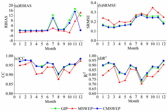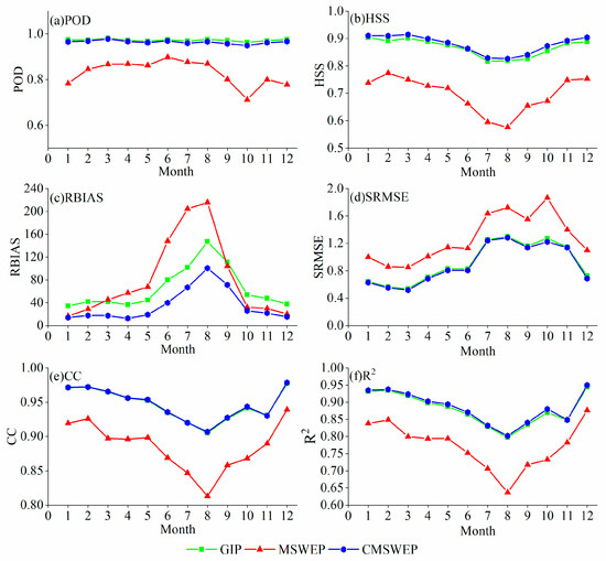 - At the daily time scale, the accuracy indices of GIP, MSWEP, and CMSWEP have significant seasonal changes except POD. GIP and CMSWEP are significantly better than MSWEP in terms of accuracy indices in each month of the year. At the monthly scale, there are also certain seasonal changes for the accuracy indices of the three datasets, but they are obviously different from those at the daily scale.