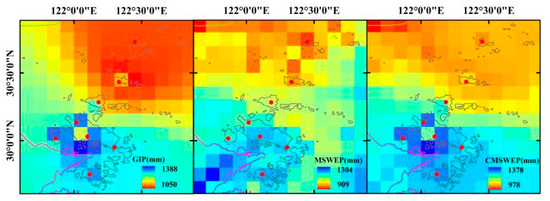 In addition to the statistics, the difference of three kinds of rainfall datasets and the influence of rainfall merging on the spatial estimation results are further explained from the rainfall spatial distribution over the Zhoushan Archipelago. Figure 7 shows the gridded multi-year averaged annual precipitation corresponding to GIP, MSWEP, and CMSWEP with 0.1° × 0.1° spatial resolution. It can be known from the figure that, both GIP and MSWEP reflect that the mean annual rainfall is higher in the Central Zhoushan Island and its adjacent ocean in the south of the study area, but is lower in the Shengsi Island and its surrounding ocean in the north. For these two datasets, the mean annual rainfall decreases gradually from the southwest to the north on the whole. However, there are substantial differences in spatial distribution pattern of annual rainfall between GIP and MSWEP. Firstly, in terms of the range of annual rainfall amount at the grid scale, MSWEP underestimates the surface annual rainfall to a certain degree, and the lowest and highest annual rainfall of all the grids are both lower than those of GIP. Secondly, grids distribution with high annual mean rainfall is not completely consistent. For GIP, the high mean annual rainfalls are mainly located in the vicinity of the Central Zhoushan Island, while for MSWEP they are mainly distributed to the southwest of the Central Zhoushan Island. Thirdly, for GIP, the annual rainfall spatial distribution is relatively smooth, while for MSWEP, the annual rainfall distribution is relatively diverse and shows more detailed characteristics. CMSWEP has the mixed features from GIP and MSWEP. For this dataset, in terms of the spatial distribution pattern of annual rainfall, the original gauge data take a dominant role in the south of the study area, i.e., the Zhoushan Island and its adjacent sea area with some high density of rain gauge, while in the Shengsi Island and its surrounding sea area in the northeast with relatively sparse rain gauges, MSWEP plays a more significant role. The range of annual mean rainfall of CMSWEP grids is close to that of GIP, indicating that the systematic error of MSWEP has been effectively reduced by observations.