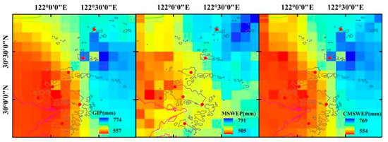 In general, at the daily time scale, the accuracy of MSWEP in Zhoushan Archipelago is lower than GIP based on sparse and unevenly distributed rain gauges. However, after merging with the rain gauge data, all the quantitative accuracy indices are improved to a certain degree. Overall, the performance of CMSWEP is not only higher than MSWEP, but also higher than GIP.