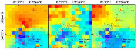 It can be seen from Figure 10 that the maximum precipitation range for the three datasets is different to some extent. The high value area of GIP is relatively concentrated, with the highest value near the Zhoushan Island and the adjacent sea area in the south. Due to the underestimation of heavy precipitation, for MSWEP the maximum precipitation is significantly lower than GIP on the whole. Additionally, MSWEP data not only reflect the maximum precipitation center surrounding the Central Zhoushan Island in the south, but also shows a second maximum precipitation center in the sea area to the east of the Shengsi Island. Especially for Pmax7, the second center of MSWEP is even more remarkable than the first one. CMSWEP has the characteristics of both GIP and MSWEP. For this merged dataset, the lowest value of the various maximum precipitation is significantly higher than MSWEP, while the highest value is relatively close to the latter.