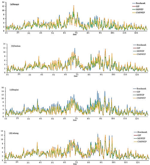 At the same time, the multi-year mean daily rainfall processes corresponding to the three precipitation datasets were compared. Figure 11 gives the specific situation of four rain gauges including Shengsi, the other four gauges are not shown due to limited space, but the situation is similar. It can be seen from the Figure that the multi-year mean daily rainfall process of GIP, MSWEP, and CMSWEP, as well as measurements by the rain gauge are fairly similar, all reflecting that precipitation is relatively concentrated from mid-June to mid-July and from mid-August to late September in the year. The daily rainfall process corresponding to GIP and CMSWEP is fairly close to the gauge measurements, while the difference between the gauge measurements and MSWEP is some apparent, and the underestimation is obvious in some periods of the year.