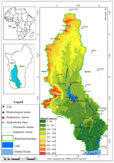 The Mono river basin is in West Africa and extends over 560 km from the north to the south []. This transboundary watershed covers 15,680 km2 and is shared by Benin and Togo (Figure 1). This watershed is home to the Nangbéto hydroelectric dam that has been providing electricity to Benin and Togo since September 1987. As this hydroelectric dam is modifying the hydrology of the river, the main part of this study will focus on the Mono river basin upstream of the dam.