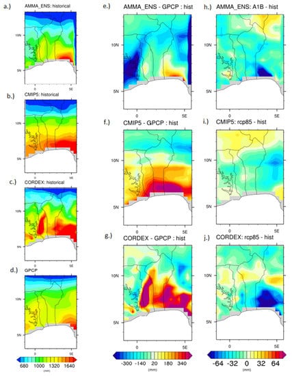 The ensemble averages were computed for CMIP5 and RCP8.5 for CORDEX. The CORDEX (Figure 2c) and CMIP5 (Figure 2b) display a greater rainfall estimation in the historical period compared to the AMMA-Ensemble (Figure 2a) and GPCP (Figure 2d), especially at the southern part. The validation made (second column of Figure 2) exhibits that CMIP5 and CORDEX overestimate the rainfall, which is about 340 mm/year. Nevertheless, the AMMA-Ensemble gives an estimation closer to the reanalysis (±20 mm/year).
