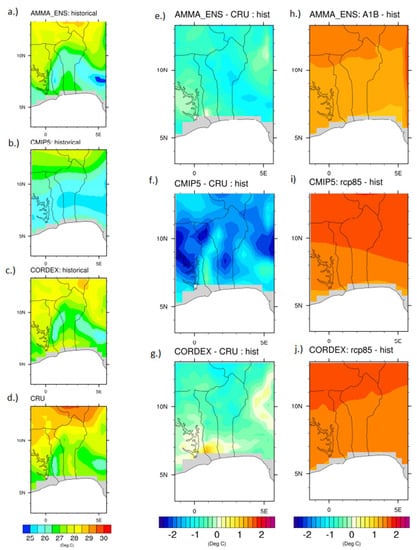 The temperature gradient was well shown by all the datasets, which increase in the northern direction (first column of Figure 3). The observed mean air temperature extracted from Climate Research Unit (CRU) varies slightly, with a maximum of 29.5 °C in the far north (the Sahel in Niger) and a minimum of 26 °C in altitude on the Togolese ridge (Figure 3d). The AMMA-Ensemble and CORDEX data give an underestimation of the temperature ranging from 0 to 1 °C while the CMIP5 presents an underestimation between 1 and 2 °C (second column of Figure 3) and the lowest rise is given by AMMA-ENSEMBLES. Unlike the rainfall, there is a very good agreement in the projected changes (increase) of air temperature from the AMMA-Ensemble, CMIP5, and CORDEX dataset. The warming is expected to vary between 1.4 °C in the south to 1.8 °C towards the north. However, AMMA-ENSEMBLES gives the lowest projected changes among all the models (third column).