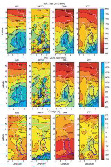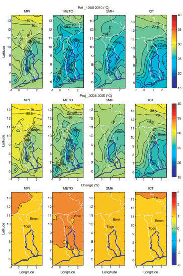 An analysis of the variations between the two periods shows moderate but contrasting changes from one model to the others, and across the domain. METO and ICT have projected a slight increase in rainfall ranging between 2% and 5% by 2050. Meanwhile, MPI projection shows no rainfall change whereas SMH has projected a strong rainfall deficit amounting up to 15% to 20% by 2050 in the south of the Mono river basin. These precipitation changes are associated with an increase in air temperature. This result is in accordance with the IPCC report [] over the West Africa region. The same conclusion was made by Sylla et al. [].