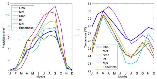 In most cases, the RCMs satisfactorily reproduce the temperature seasonality in the watershed. The simulated temperature values are underestimated, except MPI, which overestimates these values from April to July. These biases can significantly influence hydrological impact simulations as they will lead to an under(over)estimation of the high streamflow because of an under(over)estimation of the evaporative loss.