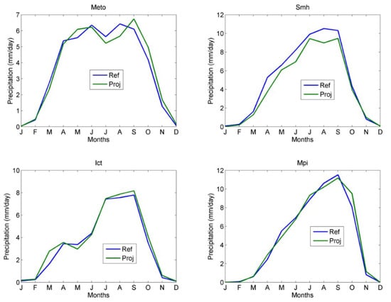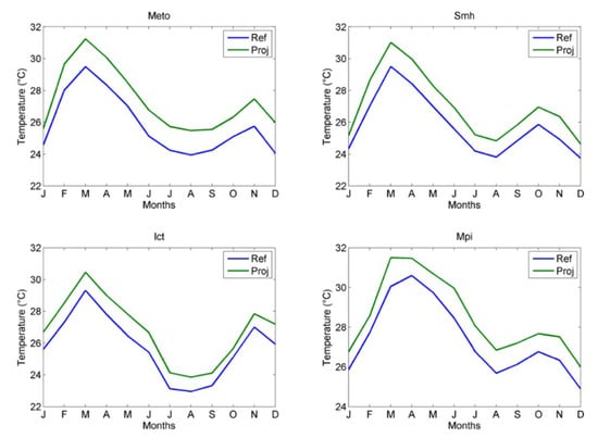 Figure 8 reveals that the four RCMs projected an increase of the air temperature by 2050. This could amplify the evaporative loss in the future and potentially induce a decrease in surface runoff. This warming is relatively uniform throughout the year and ranges between +1 and +1.5 °C (a little beyond this range for METO) in accordance with some previous studies [,].