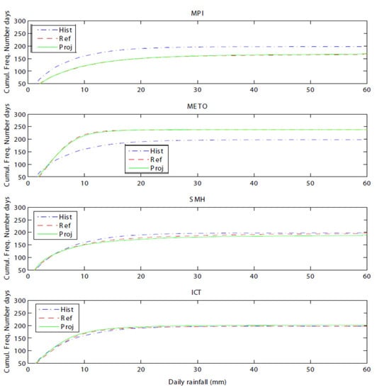 The cumulative frequency of daily rainfall intensity according to the four RCMs is illustrated in Figure 9. This figure compares the distributions of rainfall intensity between observations and the RCM simulations in the reference period, and between the RCM simulations in the reference and projection periods. For most RCMs, the sill of the cumulative daily distribution is obtained after 200 days, except METO, for which the sill is obtained after 250 days. For SMH and ICT, the distribution of daily rainfall frequencies agreed well with the observations, with many days recording less than 20 mm, and a number of wet days (about 200) similar to the observations. METO shows many wet days with a very high number of medium intensity days (5–10 mm). By contrast, the MPI model underestimates precipitation occurrence, especially for intensity values around 5 to 15 mm/day. The study of Tossou et al. [] also provides a characterization and analysis of rainfall variability in the Mono river watershed complex.