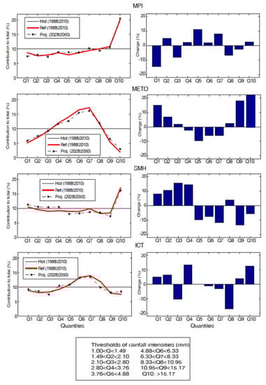Figure 10 indicates that apart from SMH, all RCMs underestimate the distribution of rainfall quantiles, especially the contribution of low rainfall (first four quantiles). This reveals an underestimation of the frequency of low rainfall. For the fifth decile to the eighth decile, the MPI and SMH simulations are close to the observed values. Meanwhile, both ICT and METO overestimate the rainfall in the basin, but this overestimation is stronger with METO. ICT and METO also underestimate the heavy rains (Q9 and Q10), unlike SMH and MPI, which simulate an increase of the daily rainfall (Q10) in the Mono river basin. Between the projection period (2028–2050) and the reference period (1988–2010), the analysis shows a relatively stable distribution of rainfall for most rainfall quantiles from MPI and ICT. For SMH, a strong decrease is found in the contribution of rainfall from the fifth quantile. Meanwhile, an increase of the contribution of the high rainfall intensities to the total rainfall is expected with METO.