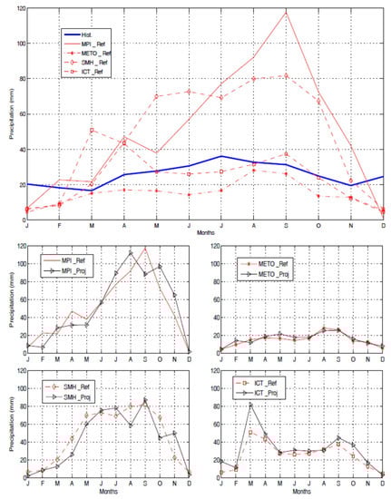 As shown in Figure 6, the four RCMs reproduce the seasonal cycle of precipitation well. This has been proven earlier by some previous works in the region [,,]. In the middle of the rainy season, MPI, SMH, and ICT overestimated the rainfall amounts while they also underestimated the rainfall amounts in January–February, which corresponds to the dry season. The smallest biases were obtained with ICT, thus making ICT the model that best replicated the rainfall regime of this watershed.