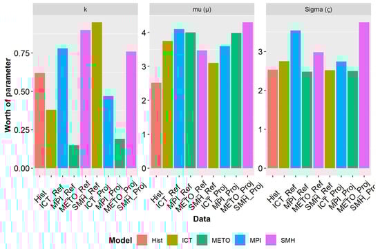 The annual maxima of daily rainfall in the Mono river basin upstream of the outlet of Nangbéto (observed and simulated values) were adjusted to a generalized extreme value (GEV) distribution. The values of the three parameters, namely k, sigma (ʂ), and mu (µ)) of the GEV distribution (Figure 12), show a similarity between the observed and simulated data for the sigma and mu parameters but strong differences for the k parameter, where K refers to the shape parameter, sigma the scale parameter, and mu stands for the location parameter []. Nevertheless, these three parameters were always positive (for observations and simulations in the reference and projection periods) (Figure 12), thus pointing to a Frechet distribution (extreme value distribution type II).