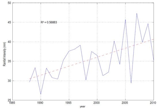 Figure 13 shows the evolution of the annual maxima of observed daily rainfall. The analysis reveals a strong increase in the annual maximum of daily precipitation that is statistically significant at the 95% confidence level. The frequency of high streamflow is not increasing, and this could be explained by the increase in temperature, which induces more evapotranspiration and thus compensates for the impact on high streamflow. This has also been proved by Ntajal et al. [] downstream of the Mono river basin. However, an in-depth analysis is still needed to prove this assumption because, in principle, very high streamflow is sometimes generated from rapid runoff in response to water excess in soil with a low retention capacity [,,]. This occurs in a very short time period, during which the increase of the evaporative demand is not really a constraint.