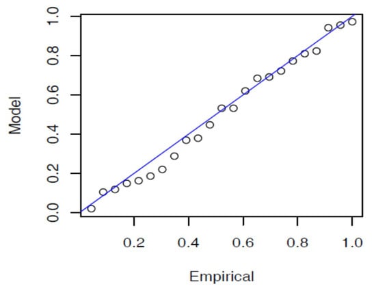 where Pr is the probability of the occurrence of an event and X stands for the random variable, which in this case is a series of annual daily maxima of rainfall. The quantile value, QT, is a magnitude of the extreme event that has a probability of and can be exceeded by a single event. A return period, , associated with a quantile value, , was adapted from Stedinger et al.’s [] equation and can be expressed as: