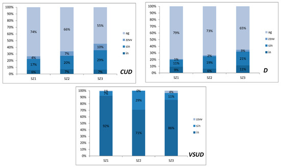 CUD, D, VSUD, I, and INSUD (irrigation from water stored at SUDs) evolution during the year for the three analyzed catchments (SZ1, SZ2, SZ3).