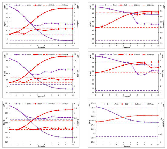 Continuous lines displayed in Figure 4 represent D and CUD for the optimal SUDs combinations (Table 3). Developing semi-intensive urban areas at the expense of rural lands does not imply failing in the proposed objectives except in SZ1 and SZ2 where CUD exceeds the upper limit for developments larger than those considered in scenarios 2 and 6, respectively. On the contrary, intensive developments more frequently break the objectives: CUD above scenario 2 and D above scenario 9 in SZ1; CUD above scenario 2 and D above scenario 7; SZ2 and CUD above scenario 4 and D above scenario 3 in SZ3.