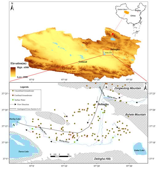 A total of 123 water samples were collected from May to October 2016 in the Delingha region. Those samples (including 6 surface-water, 105 unconfined groundwater and 12 confined groundwater samples) were collected along the general groundwater flow direction, from Zongwulong Mountain to Hurleg Lake (Figure 1). Samples of surface-water were collected from the Baying river, and samples of groundwater were collected from wells, boreholes and springs. The depths of those wells and boreholes of the unconfined aquifer are about 30–150 m. And the depths of boreholes of the confined aquifer, which is in the southern lacustrine plain, range from 100 to 500 m.