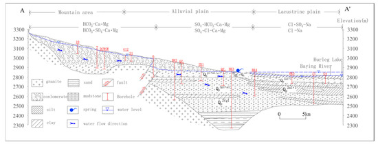 TDS, which is a comprehensive hydrochemical parameter, can be used to reflect the groundwater quality [10]. As shown in Table 1, TDS values of the unconfined groundwater range from 52 to 8954 mg/L with a mean value of 1043 mg/L. And it can be concluded that a gradually increasing trend of the TDS value of unconfined groundwater along the flow direction is occurring. This is mainly due to the fact that the unconfined groundwater in the recharge area (northern mountains area) is directly recharged from precipitation and snowmelt, while the groundwater in the discharge area (southeast and southwest area) may be influenced by relatively strong evaporation or water–rock reactions, especially in Gahai Lake and Hurleg Lake. However, the confined groundwater is always fresh water with TDS < 1 g/L. This hydrochemistry difference between unconfined groundwater and confined groundwater indicates the difference of some hydrochemical processes (such as evaporation) occurring in those two aquifers. In addition, the surface-water’s hydrochemistry feature (concentration less than that of unconfined groundwater, but greater than that of the confined groundwater) implies the great recharge and runoff conditions and slight evaporation effects in the downstream area of Baying river. These hydrochemistry distributions in different areas and different aquifers can guide the selection for water resource field.