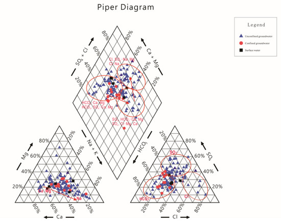Statistics analysis of the hydrochemical parameters of 123 water samples is shown in Table 1, containing the minimum, maximum, and mean values of the major ions and hydrochemical parameters. As shown in Table 1, the concentration of cations in all water samples follows the same order of Na+ > Ca2+ > Mg2+ > K+. However, the order of the concentration of anions in unconfined groundwater (SO42− > Cl− > HCO3−) is different with that of the confined groundwater and surface water (HCO3− > SO42− > Cl−). This implies the different water types that will be discussed in Section 3.2 and can indicate the difference of some geochemical processes (such as evaporation or water–rock interactions) occurring in different water.