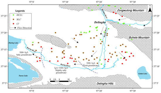 According to the analysis of groundwater types in the Delingha area, there is a clear zoning distribution along the flow path (Figure 4). The groundwater recharge area (mountainous area) is mainly featured with HCO3-type, the runoff area (the alluvial-lacustrine plain) is mainly represented by SO4-type, and the groundwater discharge area (near the Gahai Lake and Keluke Lake) is mainly featured with Cl-type.