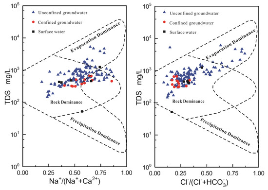 As shown in Figure 5, all the confined groundwater and surface-water samples and most of the unconfined groundwater samples lie in the rock-weathering process dominance area, indicating that the main hydrochemical process of the local water is water–rock interaction. However, a few of unconfined groundwater samples collected from the lacustrine plain with a water table depth of 3–5 m are located in the transition region between evaporation and rock-weathering, suggesting that the water in the lacustrine plain was influenced both by evaporation and water–rock interaction.