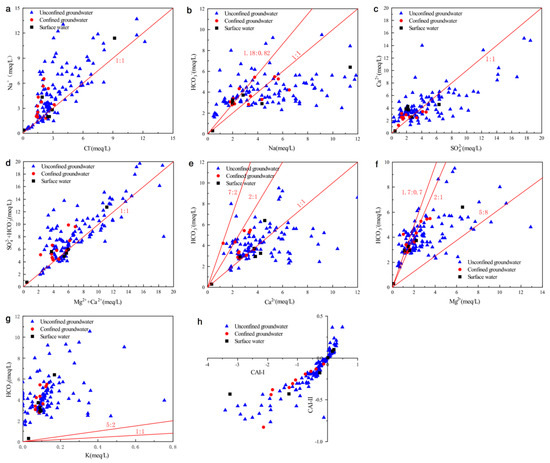 The major ion relationship was plotted to explain the hydrochemical evolution processes and the controlling mechanism of the local groundwater. The ion ratio relationship can further assist in comprehending the process of water–rock interactions in this area. Thus, according to the hydrochemistry data, ratio graphs of the major ion relationship were plotted (Figure 6).