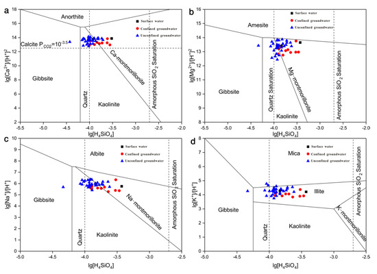 In addition, mineral stability diagrams were another important way to assess the degree of the fluid–rock equilibrium [23]. Figure 8 shows the Ca-, Na-, K-, and Mg-aluminosilicates stability diagrams of 43 water samples in this area. The software PHREEQC was applied to calculate the activities of ions, such as Ca2+, Mg2+, Na+, K+, and H4SiO4. The stability field diagrams of Ca-, Mg-, and Na-aluminosilicates (Figure 8a–c) showed that most of the unconfined groundwater samples lay in the stability region of kaolinite, while a few unconfined and all confined groundwater samples lay in the stability region of montmorillonite. Meanwhile, a number of water samples were located in the boundary between the stability fields of kaolinite and montmorillonite. And only one unconfined groundwater sample lay in the stability field of Gibbsite. Those results of Figure 8a–c showed that kaolinite and montmorillonite were in equilibrium. On the K+-H+-SiO2 system plot (Figure 8d), all water samples fall in the stability field of illite, suggesting that illite is stable. To sum up, kaolinite, montmorillonite, and illite will be in equilibrium with the groundwater in this study area. Figure 8a–d showed that no water samples lay in the Amesite, Anorthite, Albite, or K-feldspar stability field. Some previous researches indicated that water samples keeping in equilibrium with kaolinite reflected good drainage conditions [24]. Table 6 shows the 14C age of the local groundwater within the age of 5000–7000 years, indicating that the groundwater has relatively fast-updating capacity and that the groundwater runoff condition is good.