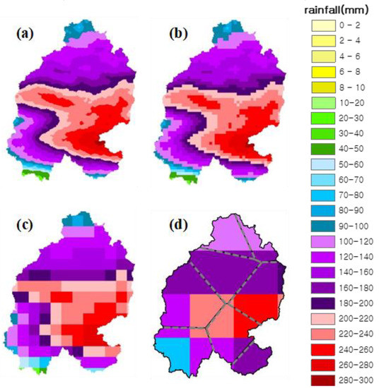 - Kim, C.; Kim, D.H. Effect of rainfall spatial distribution and duration on minimum spatial resolution of rainfall data for accurate surface runoff prediction. J. Hydro Environ. Res. 2018, 20, 1–9. [Google Scholar] [CrossRef]