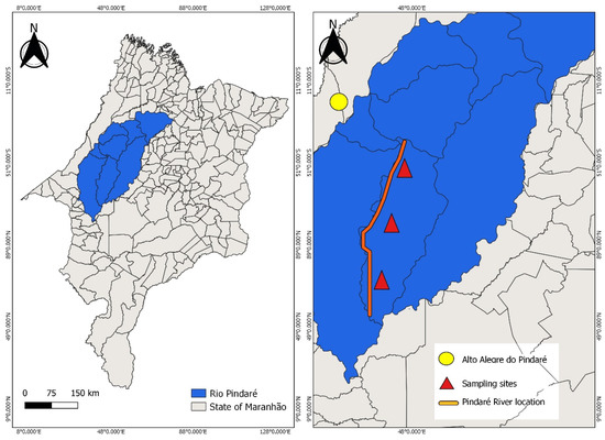 - Silva, M.R.; Silva, L.V.; Barreto, L.N.C.; Rodrigues, E.H.C.; Miranda, R.C.M.; Bezerra, D.S.; Pereira, D.C.A. Qualidade da água da bacia do Rio Pindaré, nos trechos correspondentes aos municípios de Pindaré- Mirim, Tufilândia e Alto Alegre no Estado do Maranhão. Águas Subterrâneas 2017, 31, 347–354. [Google Scholar] [CrossRef]