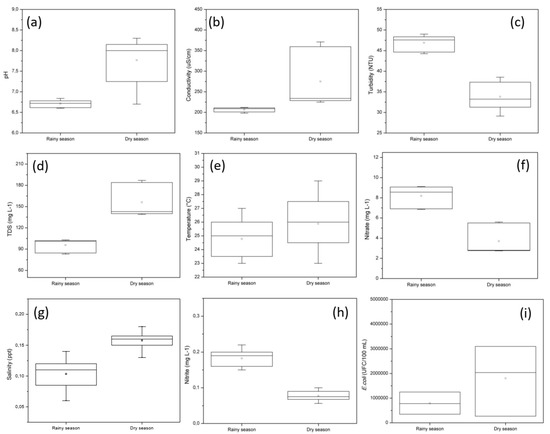 - Oliveira, T.W.S.; Silva, S.H.P.; Silva, D.F.; Viana, J.F.C.; Firmo, W.C.A.; Silva, M.R.C. Aspecto da sazonalidade nos parâmetros físico-químicos da água dos poços, Raposa—Maranhão, Brasil. Águas Subterrâneas 2019, 33, 1–9. [Google Scholar] [CrossRef]