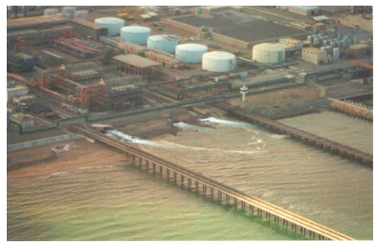 The direct discharge of wastewater into lakes, rivers, and seas can increase turbidity and change the ambient temperature []. Salinity is also a major public and scientific concern []. Coastal waters receive concentrated salt brine as discharge from seawater desalination plants (Figure 1), chemical waste from biofouling (e.g., chlorine), and fertilizers. The water bodies that receive the industrial discharge are often very sensitive environments [,], and the design of the discharge facility to disperse effluent and reduce the concentration of effluents may help protect the receiving water body.