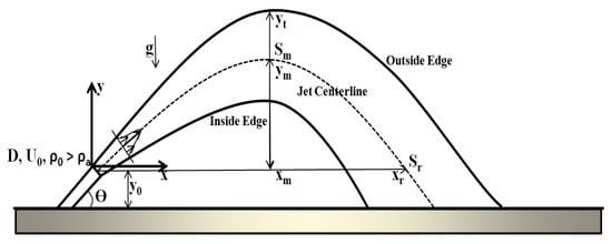 Figure 2 shows a sketch of an inclined dense jet with negative buoyancy in stagnant ambient water. The effluent discharges with an initial jet velocity U0, jet density , jet nozzle diameter D, angle ϴ to the horizontal, and ambient water density (with > ). As it is discharged, the jet reaches a maximum or terminal rise height, yt, and then falls due to the negative buoyancy, mixing with the ambient water. The jet lands on the seabed and then it spreads horizontally as a density current.