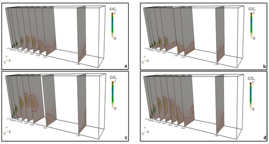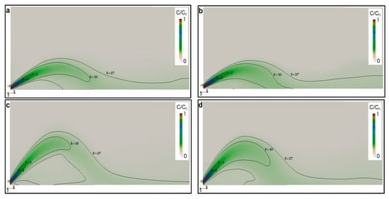 Discharge growth width at various cross-sections: the contour lines represent S = C0/C = 1 (Source: []). (a) 30°, realizable k-ε; (b) 30°, LRR; (c) 45°, realizable k-ε; (d) 45°, LRR.