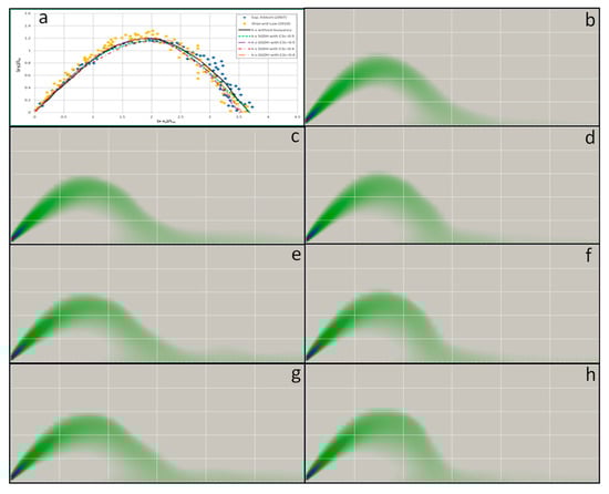 Overall discharge trajectory for 45° inclined dense jets (Source: []). (a) Centerline comparison (modeled vs. experiments); (b) standard k-ε; (c) modified k-ε with SGDH, C3ε = 0.9; (d) modified k-ε with GGDH, C3ε = 0.9; (e) modified k-ε with standard Boussinesq gradient diffusion hypothesis (SGDH), C3ε = 0.6; (f) modified k-ε with general gradient diffusion hypothesis (GGDH), C3ε = 0.6; (g) modified k-ε with SGDH, C3ε = 0.4; (h) modified k-ε with GGDH, C3ε = 0.4.