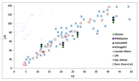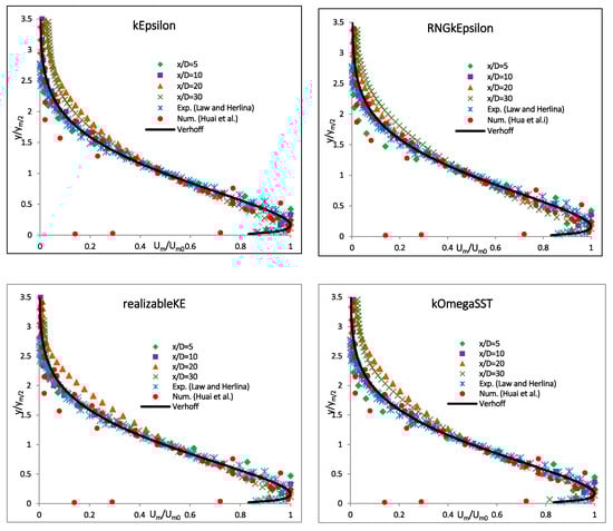 Ref. [] also used ANSYS CFX and applied the standard k-ε turbulence model for the RANS equations closure. Experimental data of dense effluent discharges were simulated by the k-ε turbulence model using both a standard and adjusted turbulent Schmidt number of Sct = 0.9. Both of these simulations with the k-ε turbulence model were more accurate than the integral models and the analytical solutions. In the experimental studies, the buoyancy-induced instabilities were observed on the lower (inner) half of the jet. However, in the study of [], the k-ε simulations (both the standard and the calibrated) underpredicted the spread of the jet and the integrated centerline dilution at the top rise of the jet, because they overestimated the influence of the stabilizing density gradients. This study only achieved qualitative comparisons and did not arrive at any conclusions about which model performed the best.