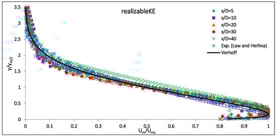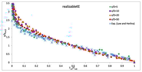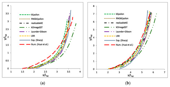 Ref. [] further studied the concentration and velocity effects on the dispersion properties and the discharge growth rate for the 30° and 45° inclinations (Figure 5). The figure presents the normalized cross-sectional concentrations for the 30° and 45° discharges using the realizable k-ε and LRR turbulence models. The realizable k-ε model predicts a narrower jet width than the LRR model does. The jets predicted by Linear Eddy Viscosity Models (LEVMs) are usually thinner than the ones predicted using the Reynolds Stress Models (RSMs), due to the assumption of isotropic turbulence in the LEVMs. The improved behavior of the LRR model could be due to stress anisotropy.