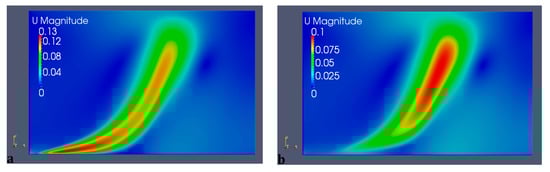 The jet centerline often follows the maximum cross-sectional velocity or concentration along the flow path perpendicular to the discharge trajectory. The best way to extract the centerline is to start at the nozzle and create a velocity vector map. Ref. [] noted that the maximum concentration and velocity profiles almost coincide, but the maximum concentration profile usually decreases more quickly than the velocity. The momentum and the buoyancy-induced instabilities also affect the trajectories of the inclined dense discharges. While the discharge rises close to the nozzle, negative buoyancy forces affect the upward momentum and decrease it until they dominate the concentration transport (somewhere after the discharge rise peak) and the maximum concentration profile sinks down toward the bed faster than the velocity maximum profile. The centerline results in [] were extracted following the maximum cross-sectional velocity similar to [].