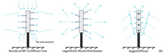 - Roberts, P.J.W.; Snyder, W.H.; Baumgartner, D.J. Ocean Outfalls. III: Effect of Diffuser Design on Submerged Wastefield. J. Hydraul. Eng. 1989, 115, 49–70. [Google Scholar] [CrossRef]