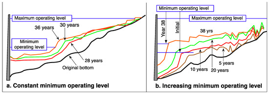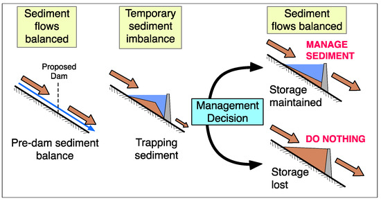 Because erosion will never stop, and reservoir capacity is limited, sediment trapping is only a transitory phenomenon. The equilibrium between sediment inflow and outflow will be restored after the reservoir becomes filled and storage benefits are lost, or it may be achieved while sustaining reservoir functions through sediment management actions. To sustain long-term reservoir capacity is a management decision (Figure 1). Despite knowledge of sediment management alternatives for reservoirs prior to the dam construction boom that began in the 1950s [12,13], nearly all reservoirs worldwide have been designed on the basis of the “life of reservoir” paradigm. Sediment inflows have been calculated using a 50 to 100 year planning horizon and the corresponding sediment storage volume allocated in the storage pool. No consideration was given to sedimentation consequences beyond this planning horizon. Reservoir design and operation without a long-term sediment management strategy is not a sustainable approach, and no longer represents an engineering best-practice.