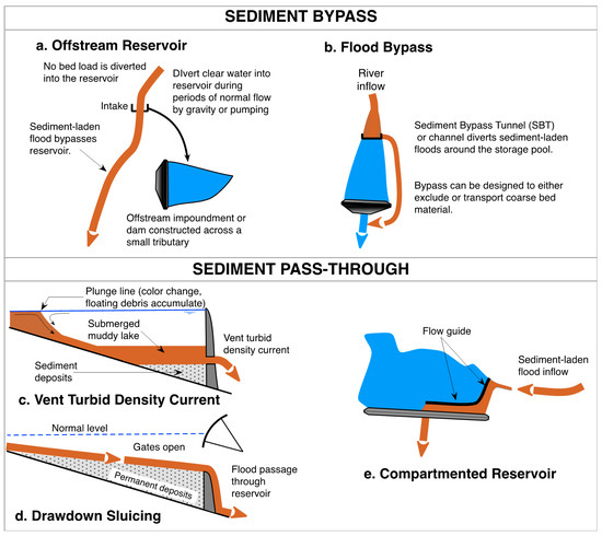 Sketches for sediment routing strategies listed in Table 1. See text for explanation. (a) Offstream Reservoir. (b) Flood Bypass. (c) Vent Turbid Density Currents. (d) Drawdown Sluicing. (e) Compartmented Reservoir.