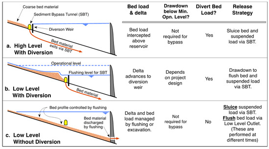 Routing strategies focus on maintaining inflowing sediment in motion (minimizing deposition), either passing sediment-laden floods around the storage zone (bypass) or though the storage zone (pass-through). The overall strategy can be summarized as, “Store clear water—release muddy flows.” This concept is particularly relevant where extreme sedimentation events can occur. Five basic strategies can be used to route sediments, as classified in Table 1. The basic hydraulic configuration of each strategy is outlined in Figure 3.