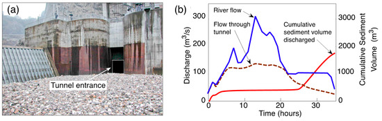 (a) Photo of the entrance to the bypass tunnel at Asahi pumped storage reservoir, Japan, with diversion weir on left. (b) Sediment bypass behavior showing discharge of bed material only at lower flows when the tunnel entrance is not submerged and scouring velocities are developed across the deposit surface (redrawn from [52]).