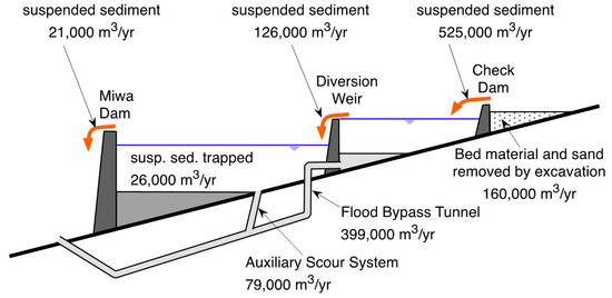 - Kobayashi, S.; Koshiba, T.; Sumi, T. Current and future study topics on reservoir sediment management by bypass tunnels. J. Disaster Res. 2018, 13, 668–676. [Google Scholar] [CrossRef]