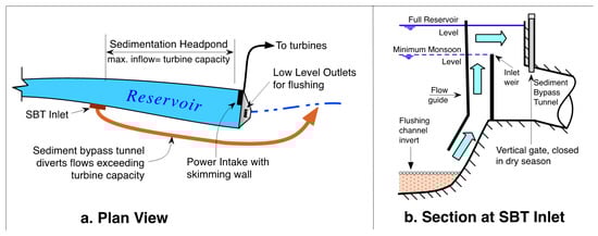 (a) At peaking run-of-river hydropower plants, use of type-C sediment bypass tunnel together with flushing allows the reservoir to operate as a desander during the monsoon and as a power peaking pool during the dry season. (b) Section through SBT inlet with flow guide and weir.