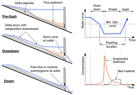 Empty flushing, or simply flushing, involves emptying the reservoir to allow the river to flow across and erode the exposed deposits, transporting the eroded sediment through low-level outlets (LLOs) and beyond the dam. The sequence observed during empty flushing is summarized in Figure 11. The flushing process involves three stages [14]: