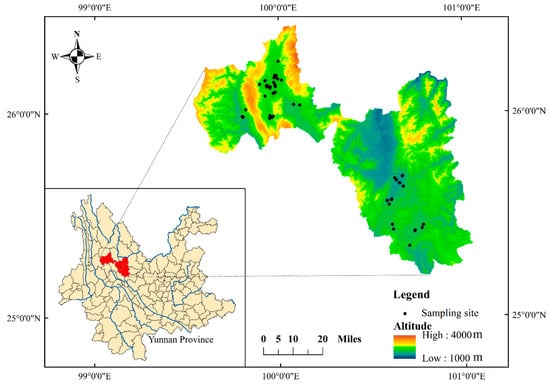 The study area occupied three counties of the Dali Bai Autonomous Prefecture, Yunnan Province, southwestern China: Binchuan County, Xiangyun County, and Wuyuan County. This region has a northern subtropical plateau monsoon climate, and the average annual rainfall is 1041.2 mm. The terrain is complex with higher elevations in the northwest and lower elevations in the southeast. There are two main types of water resources in the area, namely surface water and groundwater. Rural drinking water sources are all derived from shallow groundwater. Water supply systems included: (1) a small centralized water supply where the rural centralized water supply system serves a population of less than 10,000 people, in which pumped water is stored in an elevated water tank and then piped into a water treatment system and (2) a decentralized water supply in which individual users draw water directly from wells and store it in a water tank in their homes, with wastewater flowing into a water treatment system under gravity. Within the three counties of the study area, 28 villages were selected for sampling to capture the diversity of the topography and population distribution, in addition to the type of water supply systems (i.e., small centralized and decentralized, Figure 1).