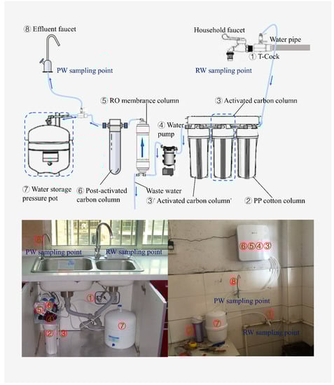 In recent years, in developing countries, small household water purification systems have gradually become widely used by consumers [14,15,16,17]. Increasing numbers of Chinese villagers are installing and using water treatment systems to maintain safe and healthy drinking water. Studies have shown that point-of-use water treatment systems can effectively reduce the risk of drinking water contamination [14,17]. Among these water treatment systems, reverse osmosis water treatment systems, which consist of a water pump, front filter (PP cotton column and activated carbon adsorption column), reverse osmosis filter element, rear filter (mostly activated carbon adsorption column), and water faucet [18], are widely used for treatment of domestic drinking water [16]. However, in China, most point-of-use water treatment systems have been designed to filter urban drinking water supplied by a centralized water supply. The applicability of these water treatment facilities in decentralized water supply models in rural areas is unclear. At the same time, it is difficult for users to judge the effect of a point-of-use water treatment system directly [19]; thus, it is of practical significance to investigate the actual effect and applicability of these systems.