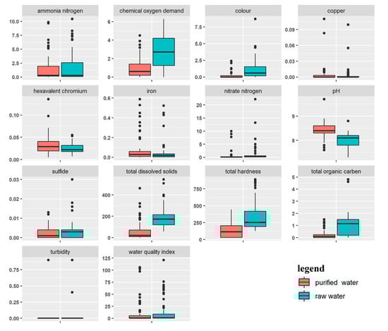 The water qualities of the raw and purified water samples were compared using a paired rank-sum test. The differences in the color, COD, total dissolved solids, sulfide concentration, TOC, pH, total hardness, hexavalent chromium concentration, and nitrate nitrogen concentration of the raw and purified water samples were statistically significant (p < 0.05). Compared with raw water, the pH and hexavalent chromium concentration of purified water were significantly increased, while the other parameters were significantly decreased (Table 2, Figure 3). The differences in turbidity and iron, copper, and ammonium nitrogen levels were not statistically significant (p > 0.05). The turbidity was lower in the raw water than purified water samples, although the difference was small (Table 2, Figure 3).