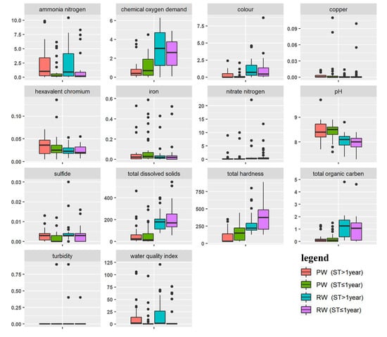 Water quality indicator levels in raw water (RW) and purified water (PW) according to the filter element service time (ST) (n = 67). Units: color (TCU), turbidity (NTU), ammonia nitrogen (mg/L N), nitrate nitrogen (mg/L N), chemical oxygen demand (mg/L O2), total hardness (mg/L CaCO3), water quality index and pH (standard units), and other parameters (mg/L).