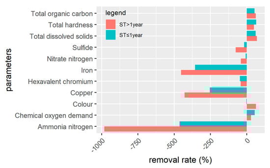 To meet the actual needs of residents in terms of water use, a faucet providing purified water has been incorporated into the water treatment system. This is a consequence of the overall effect of the water treatment system. However, further research is required to determine the specific effects of reverse osmosis membrane columns and other components in the system. In terms of the overall system, the average removal rates of COD, total dissolved solids, sulfides, and nitrates were higher when the filter service time was ≤1 year compared with >1 year. Thus, the removal efficiency of water treatment systems was stronger when the filter element was replaced more frequently [40]. One possible reason for this is leakage from the reverse osmosis membrane after the water treatment system has been used for a long time, which leads to membrane failure [41]. The average rate of sulfide removal was −18% versus −76% for purifiers with a filter service time ≤1 year versus >1 year, respectively (Figure 6). The average removal rate of ammonia nitrogen was higher for purifiers with a filter service time ≤1 year compared with >1 year. This indicates the presence of microorganisms breeding in the water treatment system or oversaturation of the pollutants adsorbed by the filter material, leading to their release into the purified water. Therefore, the risk of microbial contamination is likely to exist in water treatment systems under non-centralized water supply conditions, and this subject requires further study.